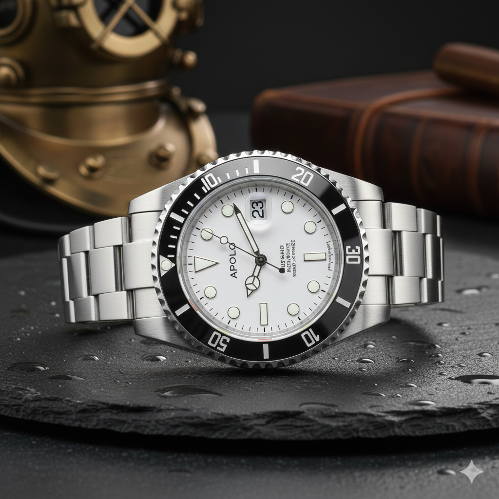 Forjado en acero inoxidable de alta resistencia, el Apolo Aqua no solo simboliza la historia de la relojería de buceo, sino que se convierte en una herramienta fiable y elegante para el hombre moderno. Su diseño se basa en la funcionalidad épica de los grandes sumergibles, pero refinado con la elegancia pulida de la marca Apolo. Con él, llevarás una pieza que ha trascendido el tiempo, lista para acompañarte a explorar las profundidades o a navegar por las exigencias de la vida diaria con un estilo inigualable.